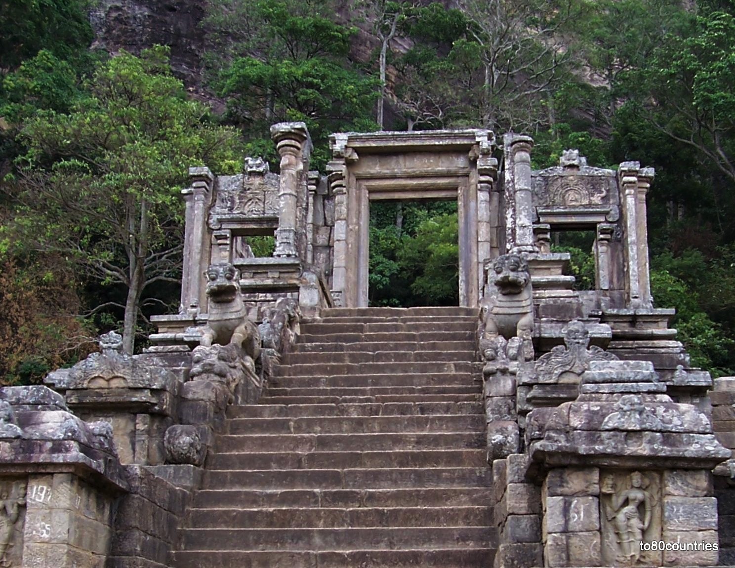Nur der prächtige Treppenaufgang und das Tor zur ehemaligen Festung blieben bis heute erhalten. Yapahuwa ist von grünen Laubwald und von hohen Palmen umgeben.