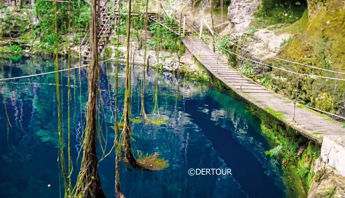 Die Cenotes waren für die Maya-Städte wegen ihres Süßwassers überlebenswichtig, dienten aber auch als Opferbrunnen bei ausbleibendem Regen. Man fand tausende Schmuckstücke und mehr als 50 Skelette in dieser „Heiligen Cenote“.